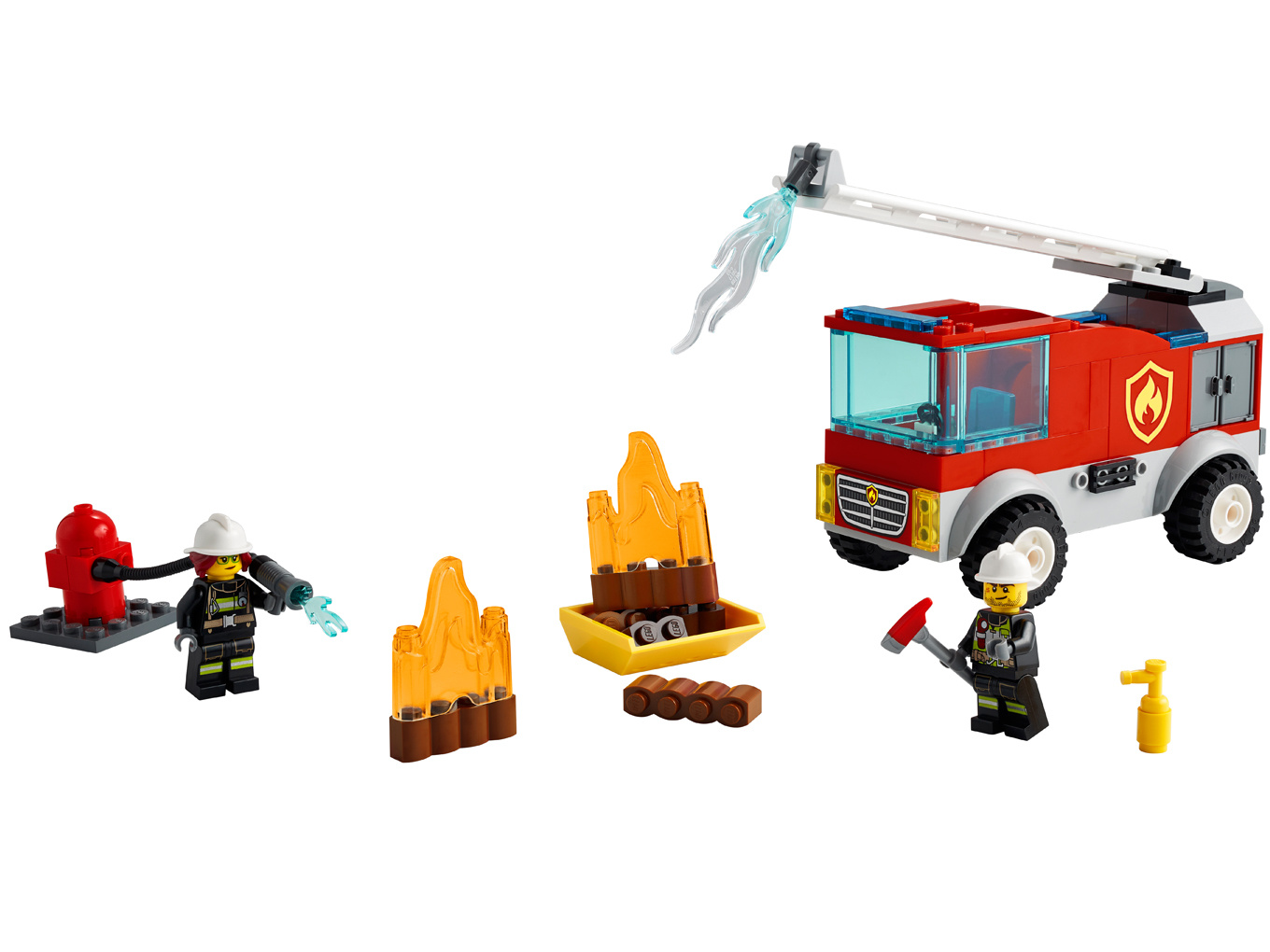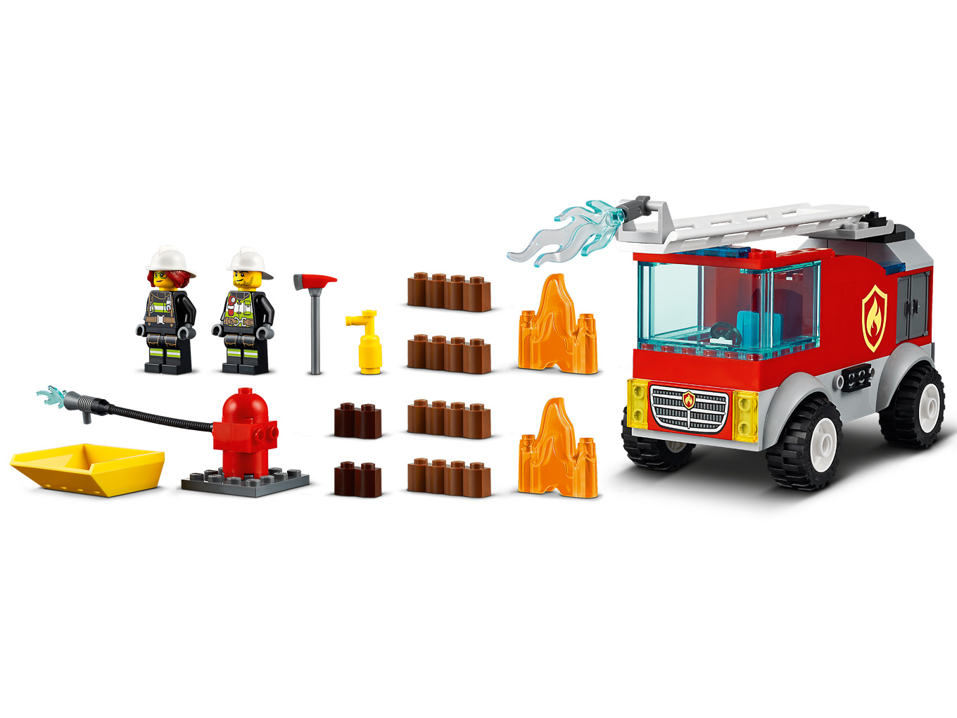 Wat zit er in de doos? Een speelgoedbrandweertruck met een ladder en blusslang, een brandkraan en stapelbare LEGO® vlammen, plus minifiguren van een brandweerman en brandweercommandante Freya McCloud uit de LEGO City tv-serie.