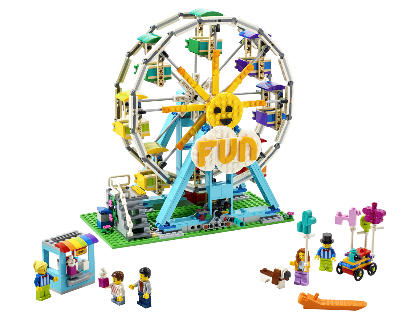 Het draaibare reuzenrad beschikt over 8 gondels waar minifiguren in kunnen zitten, een kaartjesloket, een ballonkraampje met ballondieren en een bouwbare hond.