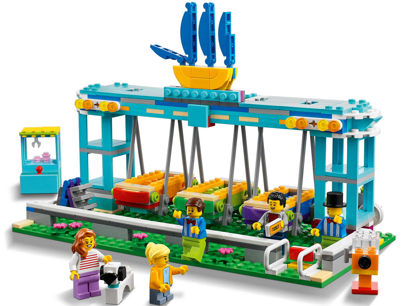 De LEGO® Creator 3in1 Reuzenrad (31119) kermisset geeft de creativiteit van kinderen een boost met 3 modellen in 1: een reuzenrad, botsauto's en schommelbootjes.