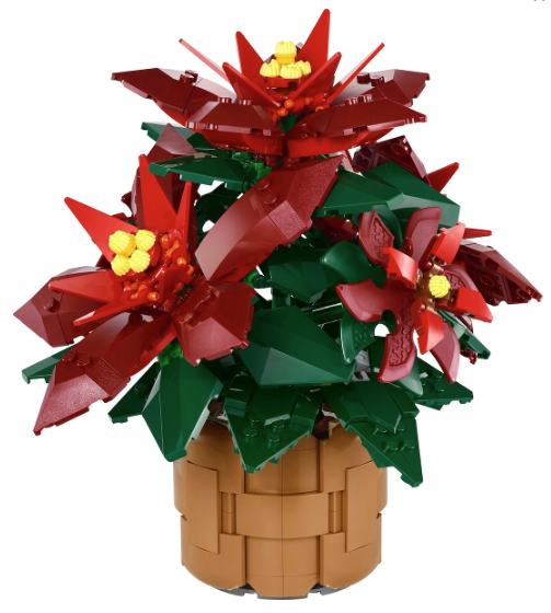 Verstelbare LEGO® plant – deze LEGO versie van de seizoensfavoriet is verstelbaar en heeft groene bladeren en 5 stervormige clusters van rode bladeren (schutbladen) met gele schijnbloemen in het midden