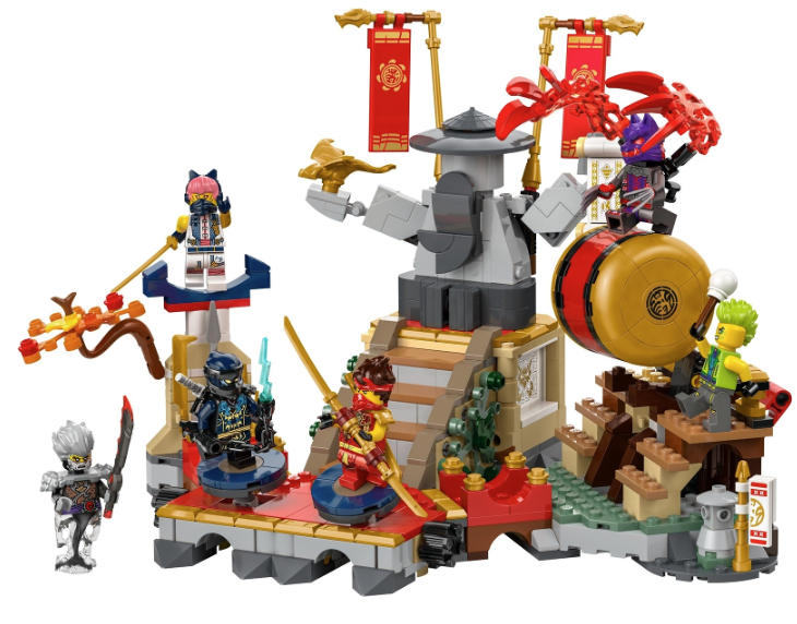 Deze LEGO NINJAGO set bevat 2 bewegende platformen waarmee kinderen spannende confrontaties kunnen naspelen met een ninja en een schurk, een grote ton die ze van de standaard kunnen duwen om de arena in te rollen en een trap die instort door aan een hendel te trekken, waardoor alle personages erop naar beneden glijden.