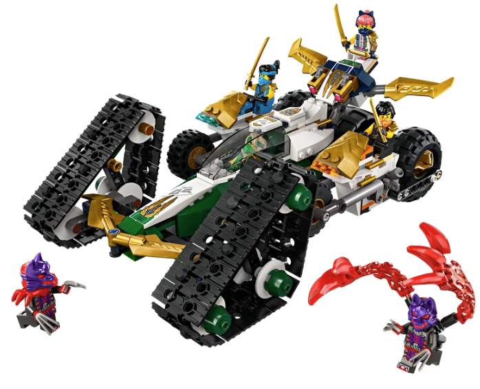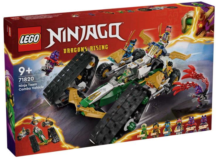 Jongens en meisjes vanaf 9 jaar kunnen avonturen boordevol actie uit seizoen 2 van de tv-serie NINJAGO Dragons Rising naspelen met dit 4-in-1 avonturenspeelgoed met het Ninjateam combivoertuig (71820). Kinderen kunnen met het grote NINJAGO voertuig spelen voordat ze het splitsen in 4 kleinere voertuigen: Sora's zweefvliegtuig met 2 noppenschieters, Lloyd's offroad racewagen en Cole en Nya's motoren.