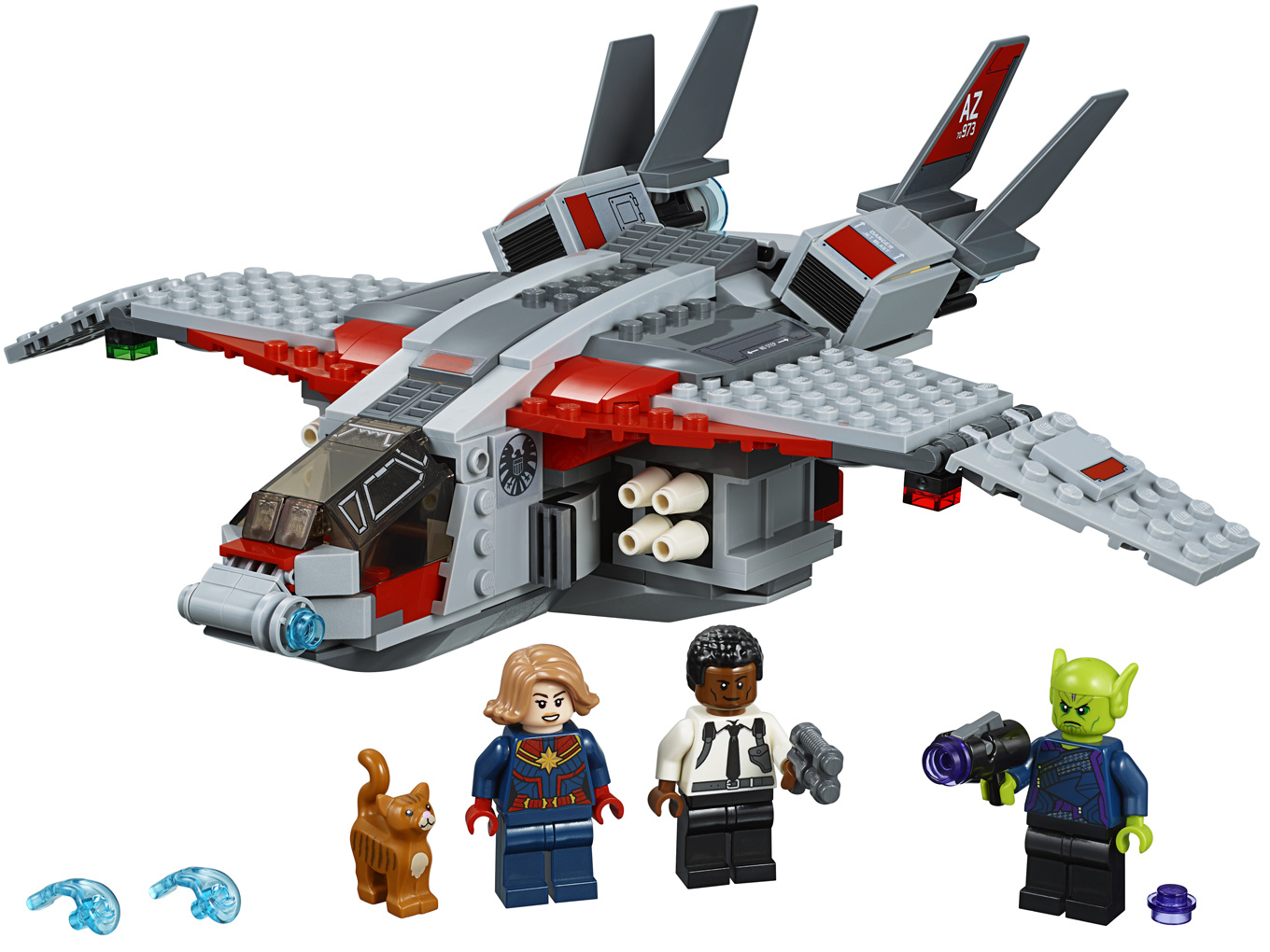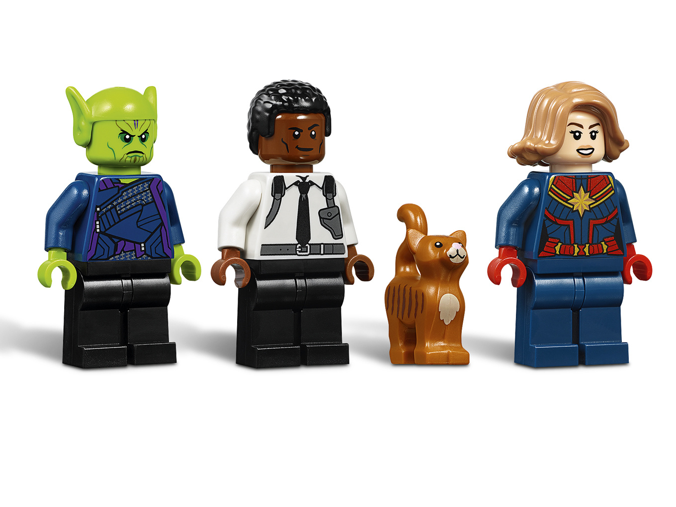 Deze Captain Marvel bouwset is inclusief 3 minifiguren die nieuw zijn vanaf januari 2019: Captain Marvel, Nick Fury en Talos, plus een LEGO® figuur van Goose de kat.